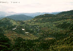 下の写真、遠くに白い建物、赤い屋根の芳ヶ平ヒュッテが見えます。